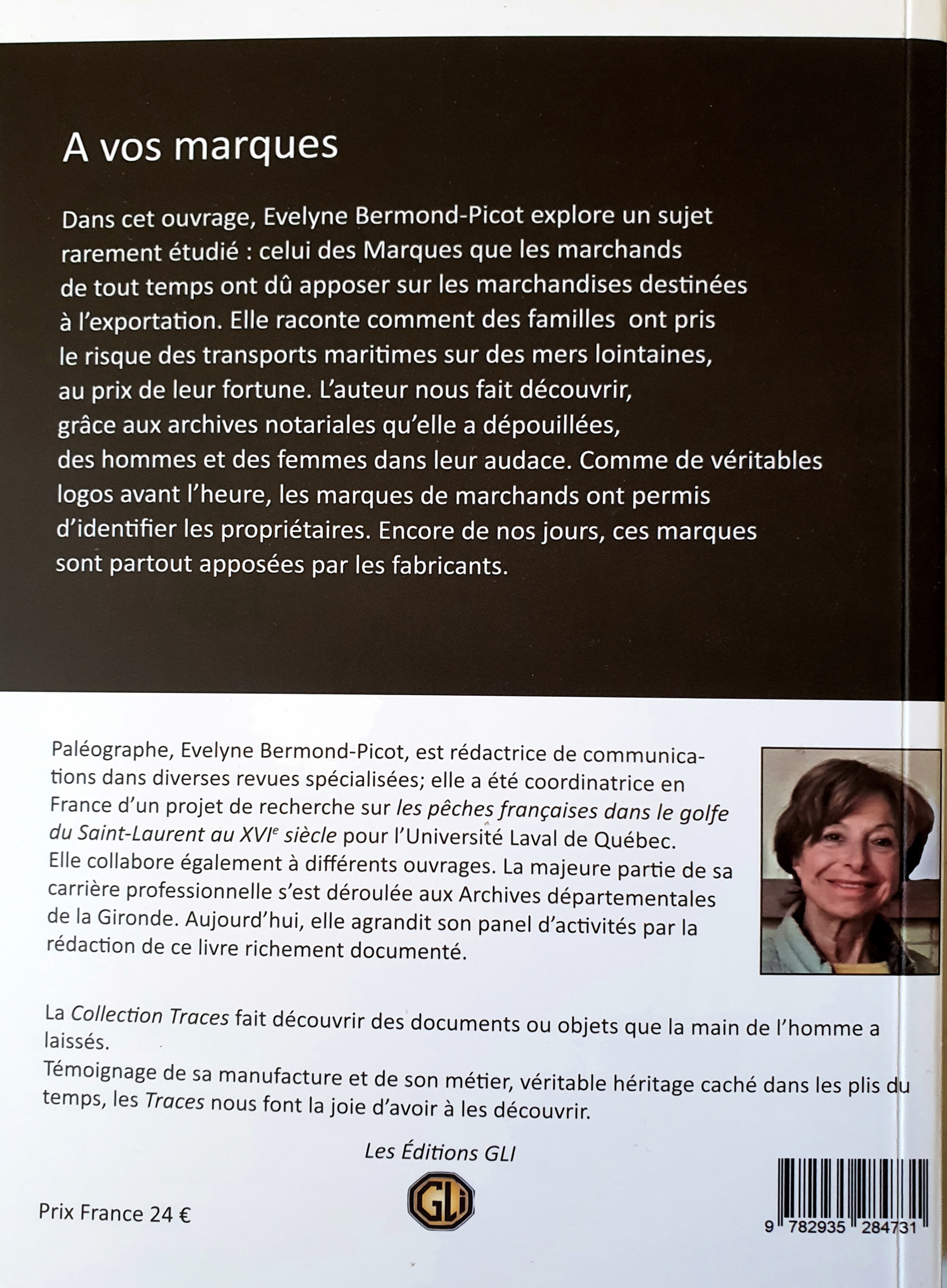 Les Editions GLI sont heureuses de vous annoncer la parution d’un nouvel ouvrage intitulé Les Marques de Marchands du XIIIème au XIXème siècle. d’ Evelyne Bermond-Picot. Dans ce livre, Evelyne Bermond-Picot explore un sujet rarement étudié, celui des Marques de Marchands. A toutes les époques, ceux-ci ont dû apposer leur signe distinctif afin d’identifier leurs marchandises destinées à l’exportation. L’auteur raconte comment les familles d’armateurs ont pris le risque des transports maritimes sur des mers lointaines, au prix de leur fortune. Elle nous fait découvrir les hommes comme les femmes dans leur audace grâce aux archives notariales qu’elle a dépouillées. De Bordeaux à Augsburg, comme de véritables logos avant l’heure, les propriétaires faisaient apposer une marque sur les barriques de vin, les barils de poisson ou autres marchandises. La marque est la reproduction, faite avec plus ou moins de fidélité, du cachet du marchand. Dans les contrats notariés, elle est reproduite généralement en marge de l’acte ou placée en bas pour servir de signature. L’utilisation d’une marque, outre le fait qu’elle soit destinée à l’identification des marchandises, peut servir dans certains cas à dater l’achèvement d’un édifice. La présence de ces marques sur certains objets trouvés dans des épaves peut aussi aider à identifier celle-ci. Les marchands et les marchandes que nous allons rencontrer dans ce livre ont vécu principalement dans la seconde moitié du XVIème siècle, période de troubles provoqués par les huit conflits des guerres de religion et des épidémies de peste récurrentes. Malgré ces vicissitudes, ces hommes et ces femmes courageux chercheront toujours à vaincre les problèmes du moment. En continuité du sujet, encore de nos jours, les marques sont partout apposées par les entreprises.