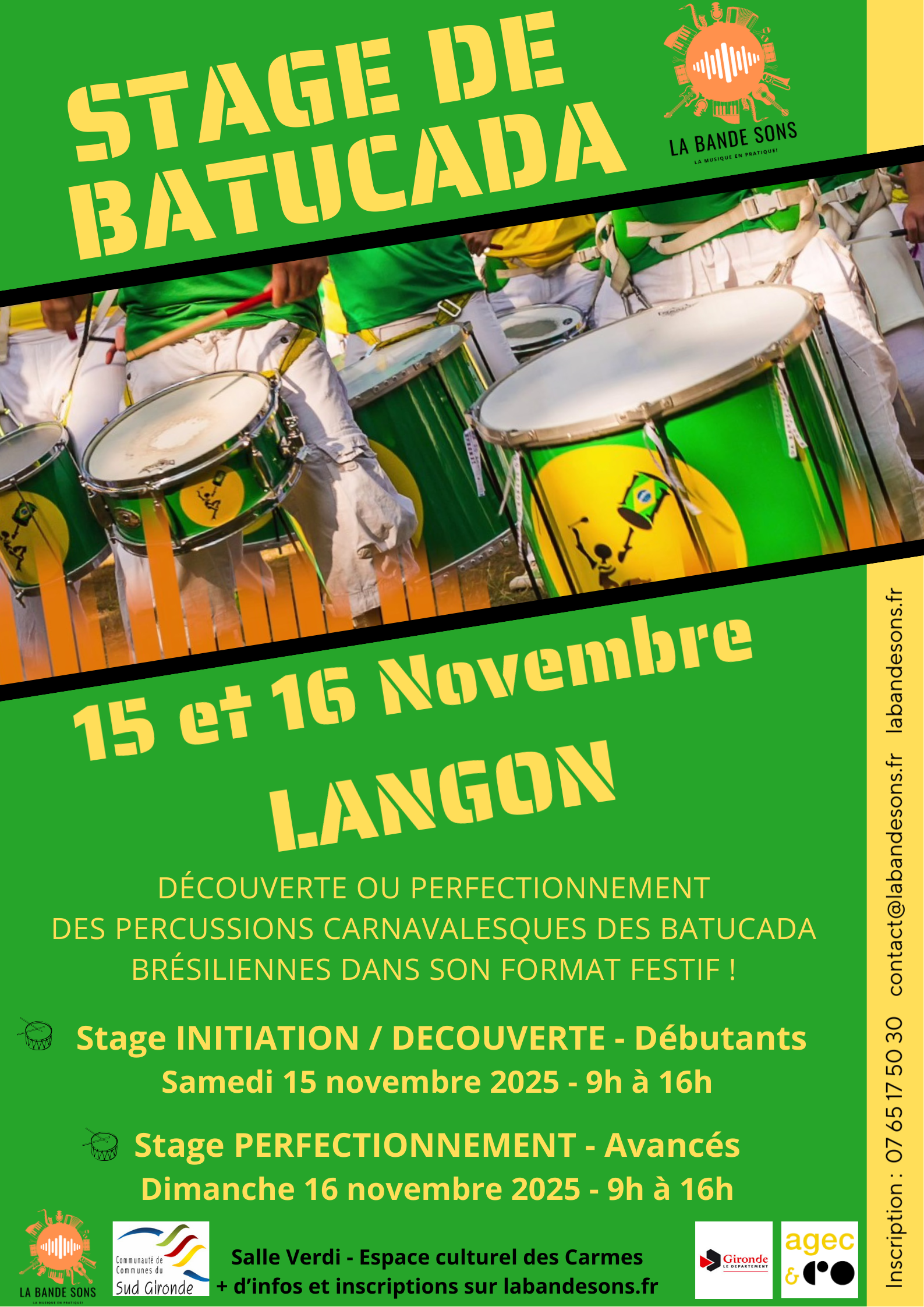 Stage Batucada – Percussions Afro-Caribéennes avec Grégoire Merleau Une immersion musicale au cœur du Brésil, à Langon ! L’association La Bande Sons propose un week-end exceptionnel de percussions afro-caribéennes les 15 et 16 novembre 2025, animé par Grégoire Merleau, musicien reconnu et passionné par les rythmes brésiliens. Offrez-vous le temps d’une journée une véritable immersion dans l’univers festif et collectif des écoles de samba ! Deux stages, deux niveaux : Samedi 15 novembre : Initiation / Découverte – pour les débutants, adultes et enfants à partir de 8 ans (accompagnés d’un parent). Dimanche 16 novembre : Perfectionnement – réservé aux pratiquants expérimentés et aux musiciens confirmés. Lieu : Salle Verdi – Centre Culturel des Carmes, Langon (accès école de musique) Programme de chaque journée : Accueil à 9h, stage de 9h30 à 16h avec pause déjeuner conviviale (repas tiré du sac). Au programme : apprentissage des instruments de la Batucada (Surdos, Caixa, Timba, Répique…), techniques rythmiques, travail collectif et approche culturelle. Une journée de partage, d’énergie et de bonne humeur au rythme des percussions brésiliennes ! Matériel fourni par l’association (possibilité d’apporter son instrument). Protections auditives obligatoires – pique-nique à prévoir pour le midi. Tarifs : 10 € (stage du samedi) – adhérents 15 € (stage du dimanche) – adhérents 15 € d’adhésion annuelle pour les non-adhérents. Inscriptions & renseignements : E-Mail: contact@labandesons.fr Phone: 07 65 17 50 30 labandesons.fr Nadège