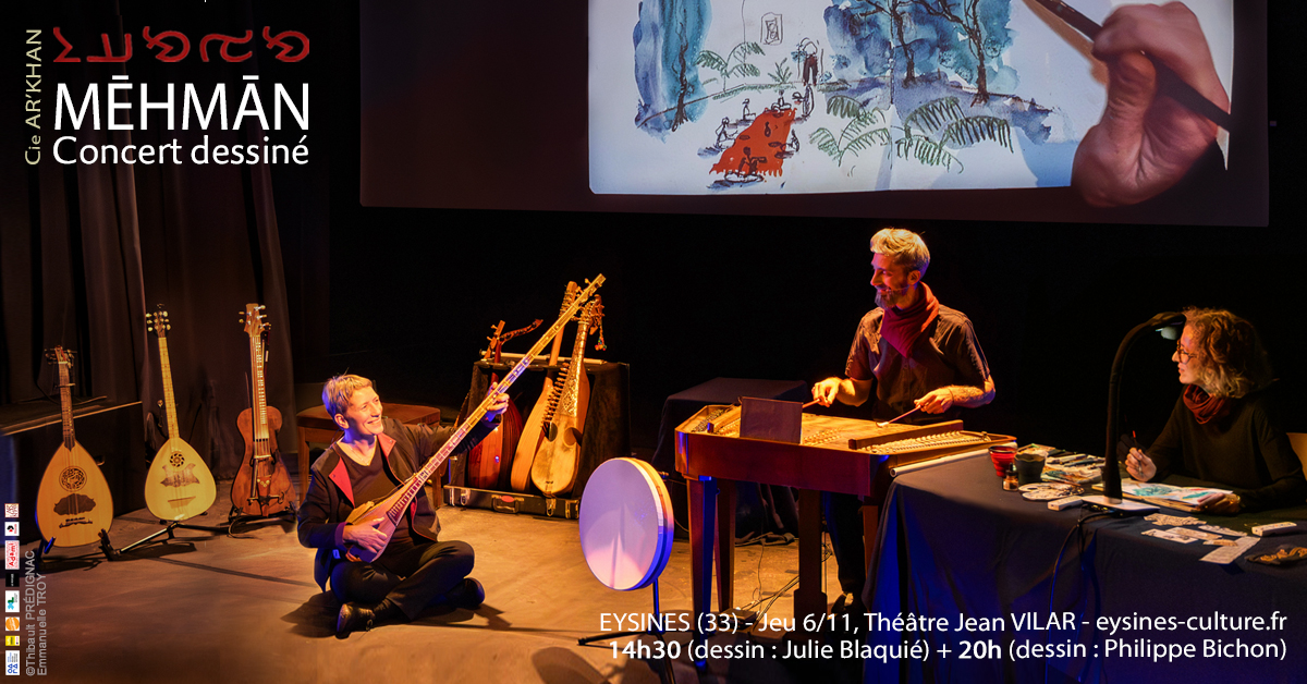 Concert dessiné Eysines (notre 1ère avec Julie Blaquié !!) et toutes dernières nouvelles - AR'Khan on se retrouve à EYSINES ? + Du nouveau pour Ar'Khan IMPORTANT : Liens en bleu | Afficher les images ! | Version en ligne Hola Adishatz Καλημέρα Merhaba سلام Салом Salom བཀྲ་ཤིས་བདེ་ལེགས 你好 Сайн байна Chers amis, chers soutiens - précieux - d'Ar'Khan Rien de prévu le jeudi 06/11 (après-midi / soir) ? Alors bienvenue ! : comme annoncé en septembre, nous serons au Théâtre Jean Vilar / Le Plateau à EYSINES (33), pour 2 représentations différentes de notre Concert dessiné MĒHMĀN 14h30 (au dessin : Julie BLAQUIÉ - pour la 1ère fois, à l'issue d'une résidence soutenue par Eysines. On y retrouvera Pauline MASSON, regard extérieur :) 20h (au dessin : Philippe BICHON) Tout public à partir de 11 ans ; 16€ / 13 € / 7,50€ Réservation conseillée https://mairie-eysines.maplace.fr/evenement/7966/mehman Infos : 05 56 16 18 10 - culture@ville-eysines.fr 2025/26 : SUITE TOURNÉE MĒHMĀN (Clic pour accéder aux liens vers les salles) : parlez-en à vos proches d'un peu plus loin !... : Civray (86) La Margelle 28/11, Artigues (33) Cuvier le 23/01, Poitiers (86) M2Q 03/02 (Escale Réseau 535), Eymet (24) Espace Culturel le 14/03 • Du nouveau dans la Compagnie - YOUPI ! : La conteuse et comédienne Monia LYORIT me rejoint sur la lecture musicale OBSTINÉMENT CHOCOLAT - succédant à Olivier KA. La reprise se fera début 2026 - de savoureux moments en perspective !... PS : Rappel : AR'KHAN a désormais un compte Instagram ! "La Route de la voix - CARTE DE VISITE AUDIO, 6mn" (E.Troy) ARKHAN-ASSO.COM | Ils nous ont fait confiance | Livre d'or Articles : FIP, Globe-Trotters | Facebook | Youtube Bandcamp | Instagram | Soundcloud NOUS AIDER (on en a besoin ! ;) / FAIRE PLAISIR AUTOUR DE VOUS ? Nos spectacles, concerts, ateliers Nos films et albums "CATALOGUE" EN LIGNE / LIENS DOSSIERS VERSION PDF TÉLÉCHARGEABLE 2 LONGS-METRAGES (Autres sons de cloches, Carnet(s) de Chine) 3 ALBUMS (Trans-Eurasienne, Orient(s), Mēhmān) que vous ne trouverez pas sur Spotify ou autre, mais : > sur HELLOASSO > sur BANDCAMP TEASERS VIDÉO de nos spectacles & ateliers / EAC [cliquer sur les affiches] Orient(s) (Emmanuelle Troy, Luc Girardeau) Orient(s) (Emmanuelle Troy, Luc Girardeau) LA MURAILLE ET LE VENT - DUO La Muraille et le vent (Emmanuelle Troy) Collectif Woudi Teaser Teaser Voix et voyages Trans-Eurasienne - Voyage musical et littéraire (Emanuelle Troy) Collectif Woudi Teaser Emmanuelle