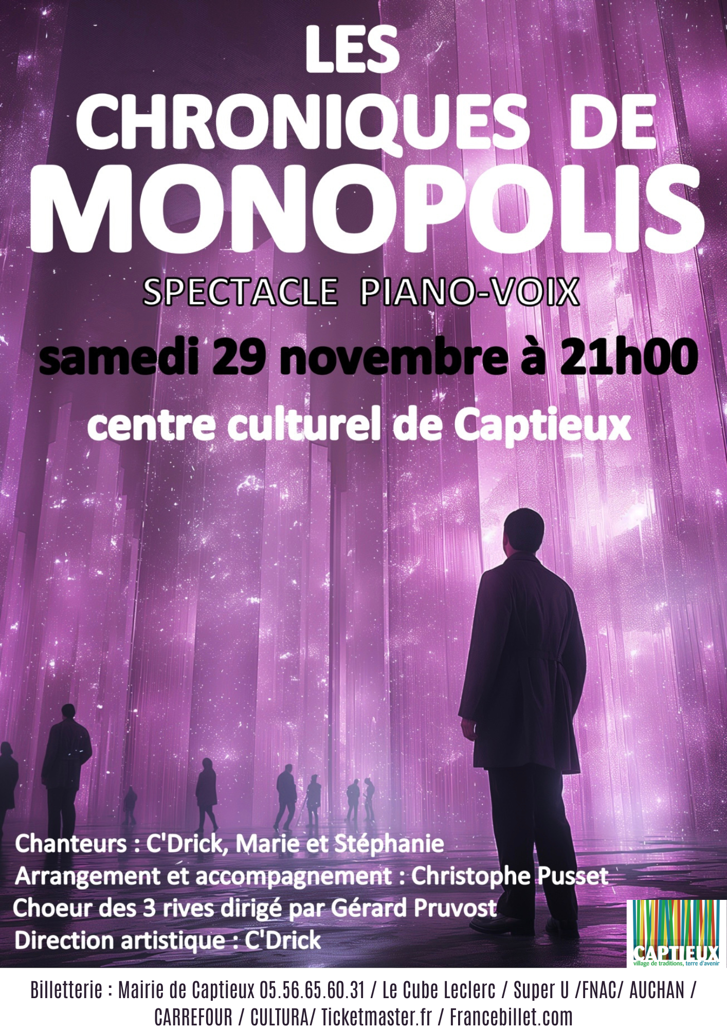 Communication concert - CAPTIEUX - 29 Novembre Les chroniques de Monopolis Samedi 29 novembre 2025 Centre Culturel à 21 h 00 Le plus grand opéra-rock français comme vous ne l’avez encore jamais entendu. Venez redécouvrir les tubes incontournables de ce chef-d’oeuvre musical. De Ziggy à Quand on arrive en ville, des Adieux d’un sex-symbole à Le monde est stone, sans oublier Le blues du businessman, laissez-vous entraîner dans les rues de Monopolis par 3 chanteurs et un choeur de 30 choristes dans une version inédite piano/voix. Bienvenue dans les Chroniques de Monopolis, un spectacle aux mélodies inoubliables composées par Michel Berger et Luc Plamondon. Entrée : 15 € Anaëlle DAYNES CHARGEE DE COMMUNICATION ET D'ANIMATION COMMUNE DE CAPTIEUX communication@captieux.fr 06.15.87.96.56 05.56.65.88.97 Anaëlle DAYNES