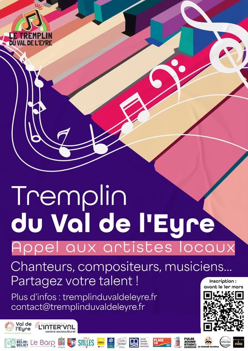 Tremplin du Val de l'Eyre - il n'est pas trop tard pour vous inscrire - 2 mars La Boîte à Meuh est partenaire du Tremplin du Val de l'Eyre. Cela promet de chouettes soirées de partage et convivialité ! On nous glisse à l'oreille qu'il reste des places ! N'hésitez pas à vous jeter à l'eau ou a diffuser l'info. Musiciens et musiciennes, vous avez jusqu'au 02 mars 2026 pour présenter votre candidature. Le tremplin est ouvert à tous les musiciens et chanteurs, amateurs et semi-professionels, se présentant individuellement, en duo, en trio ou sous forme de groupe. L’un au moins des membres devant résider ou être originaire de la zone géographique Sud Gironde et Nord des Landes. Le concours est ouvert à tous les genres de musiques actuelles. Chaque groupe ou artiste devra présenter au moins 1 composition personnelle. Ce projet musical ambitieux porté L’INTER’VAL (Centre Socioculturel du Val de l’Eyre) et l’association Les Moutons De Pougniquet a pour objectif de révéler les talents locaux et de leur offrir une opportunité de se produire sur scène. Le Tremplin du Val de l’Eyre s’articule autour de cinq événements. Deux lauréats seront désignés lors de chaque événement pour participer à la finale. Un candidat sera retenu par le vote du public et un second candidat par un jury représenté par les partenaires du tremplin. Les phases de qualifications auront lieu : - Samedi 28 mars à la salle des fêtes de St-Magne. - Samedi 4 avril à la salle des fêtes de Lugos. - Samedi 18 avril à la salle des fêtes Jean-Paul Fabre à Belin-Beliet. - Samedi 2 mai à la salle des fêtes du bourg de Salles - La finale aura lieu le Samedi 9 mai au centre culturel du Bateau Lyre au Barp. Plus d'infos sur https://tremplinduvaldeleyre.fr/ Tremplin du Val de Leyre